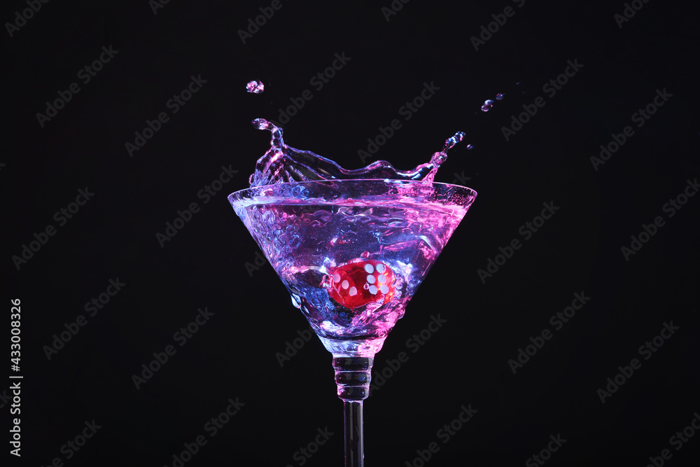 Obraz na plátně Casino dice falling into glass of alcohol drink on black background