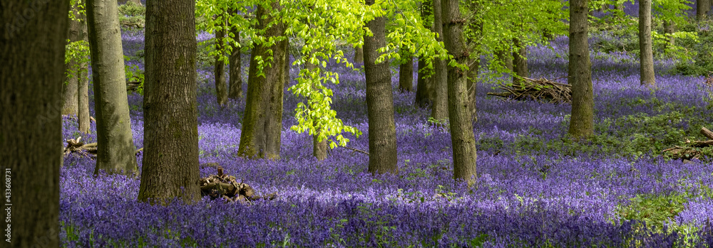Obraz na plátně Carpet of bluebells growing in the wild on the forest floor under beech trees in springtime in Dockey Woods, Buckinghamshire UK