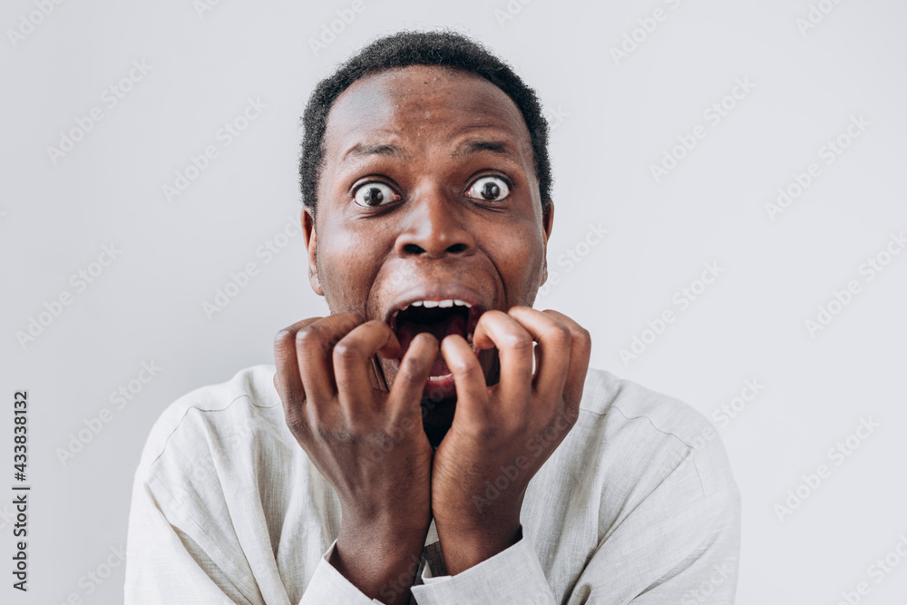 Obraz na plátně Portrait of a terrified African man staring in horror at the camera and putting his hands to his mouth in a light linen shirt on a white background