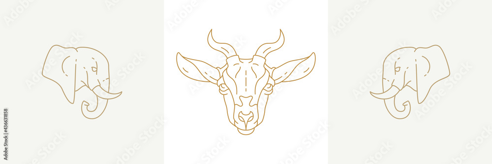 Obraz na plátně Heads of elephants and goat in linear style vector illustrations set