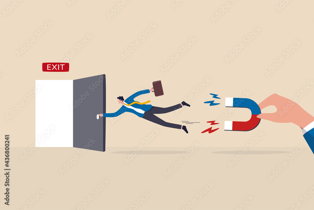 Obraz na plátně Incentive and welfare program for employee retention, building staffs loyalty reduce resignation rate for important talent, boss holding magnet to pull back resigned or leaving employee