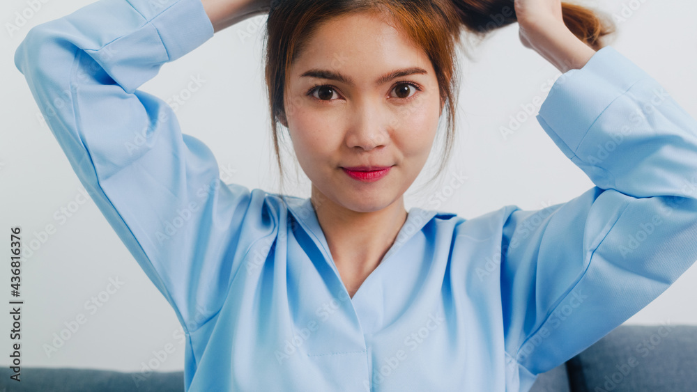 Obraz na plátně Young Asian woman doing long hair style looking in front mirror, Happy female make ponytail hairstyle to improve herself ready to working in bedroom at home