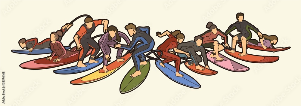 Obraz na plátně Surfer Action Group of Surfing Sport Man and Woman Players Cartoon Graphic Vecto