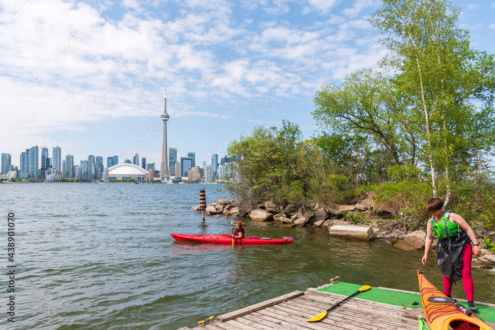 Obraz na plátně Setting out sea kayaking from a dock on Centre Island in Toronto, with the downtown city skyline in the background