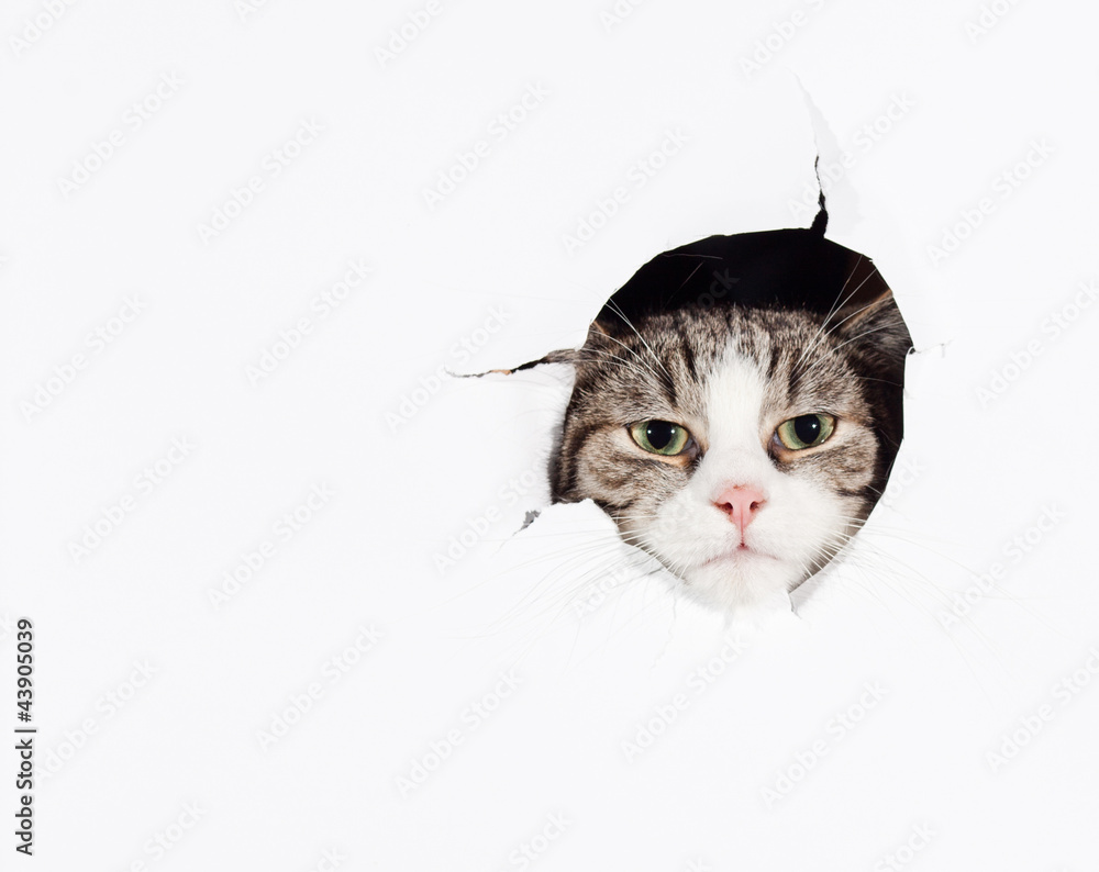 Obraz na plátně Funny cat putting his head into a paper teared hole