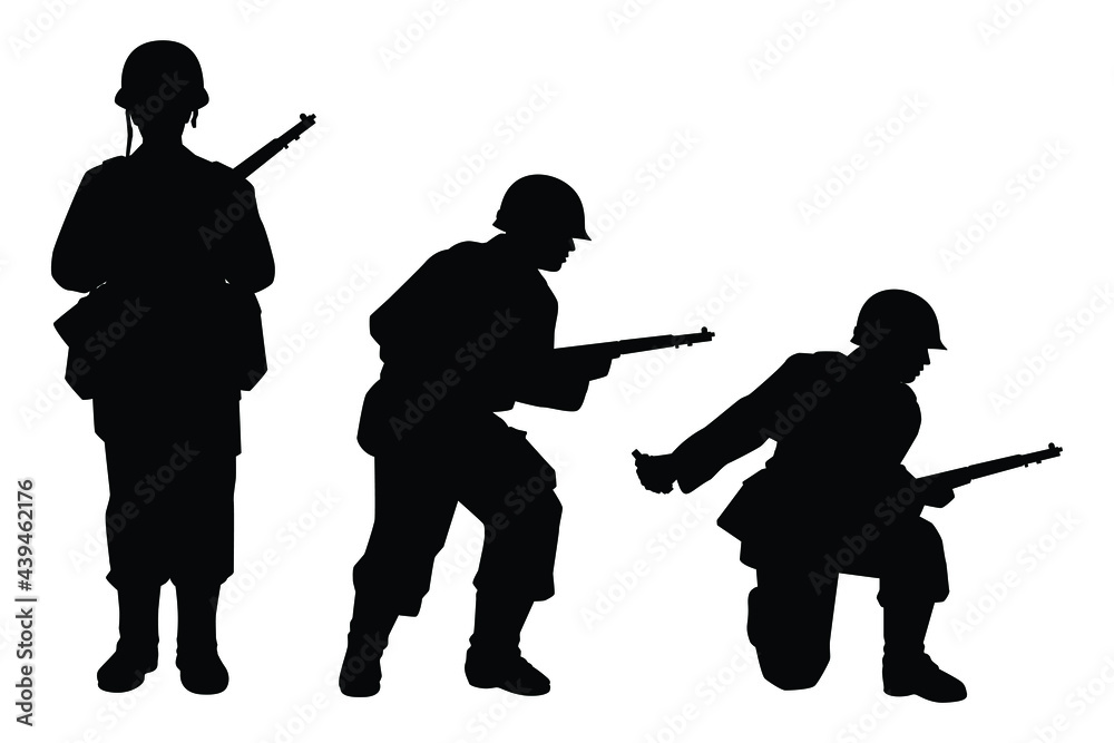 Obraz na plátně Set of US soldier with a rifle weapon during world war 2 silhouette vector on wh