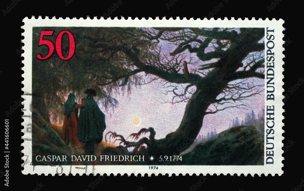 Obraz na plátně A stamp printed in Germany shows Detail of painting Two Men Contemplating the Moon in MET Museum, New York U