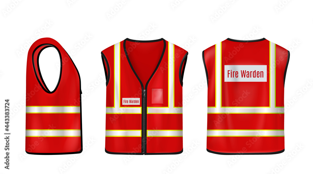 Obraz na plátně Fire warden safety vest front, side and back view, red sleeveless jacket with re