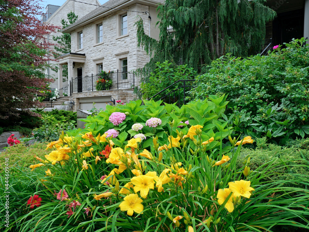 Obraz na plátně colorful flowers and yellow and red daylilies in front garden on a residential street