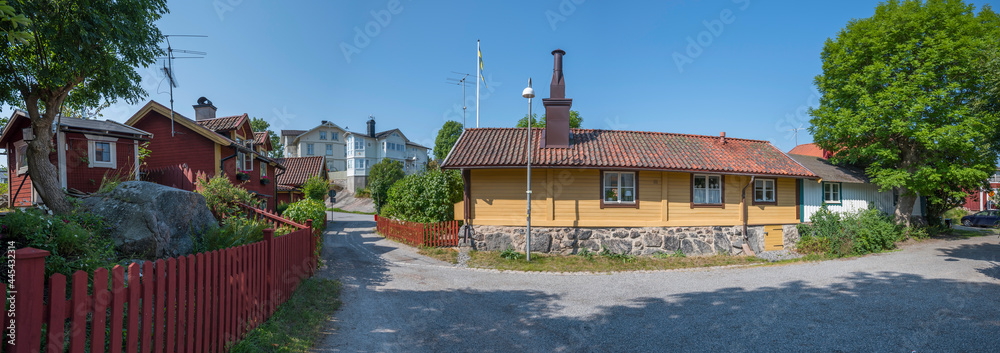 Obraz na plátně Road crossing with old tree houses in the old district town Vaxholm in Stockholm