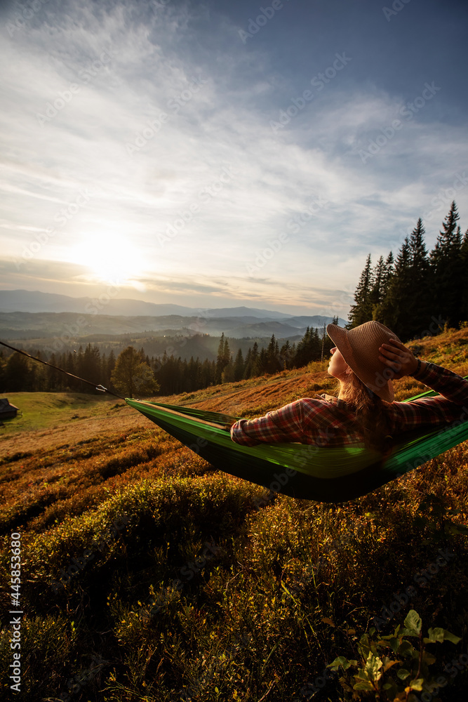 Obraz na plátně Woman hiker resting after climbing in a hammock at sunset