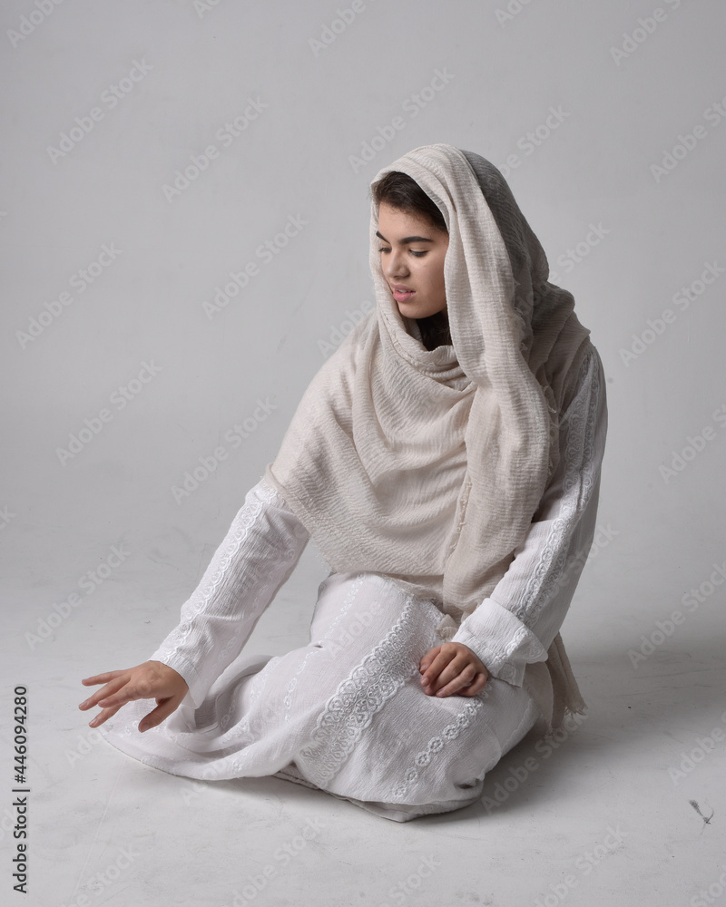 Obraz na plátně Full length portrait of young woman wearing classical white gown and a head covering veil in biblical style, sitting pose on light studio background