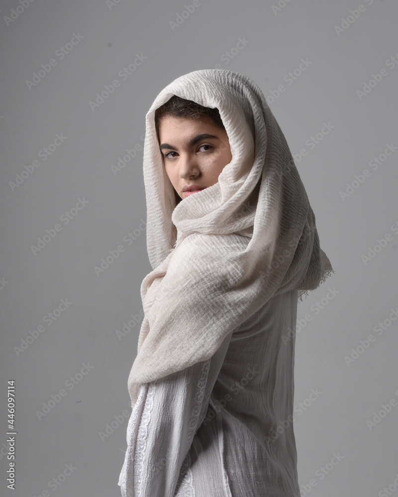 Obraz na plátně Full length portrait of young woman wearing classical white gown and a head covering veil in biblical style, sitting pose on light studio background