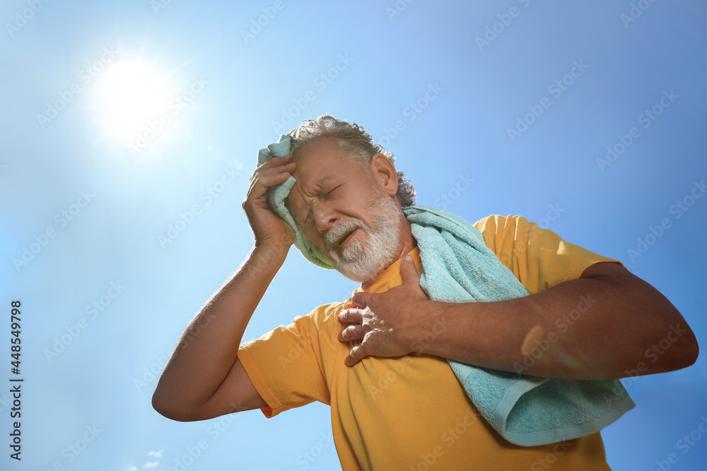 Obraz na plátně Senior man with towel suffering from heat stroke outdoors, low angle view