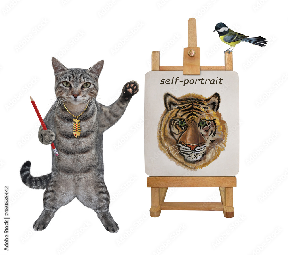 Obraz na plátně A gray cat artist with a pencil paints his self-portrait on a canvas on an easel