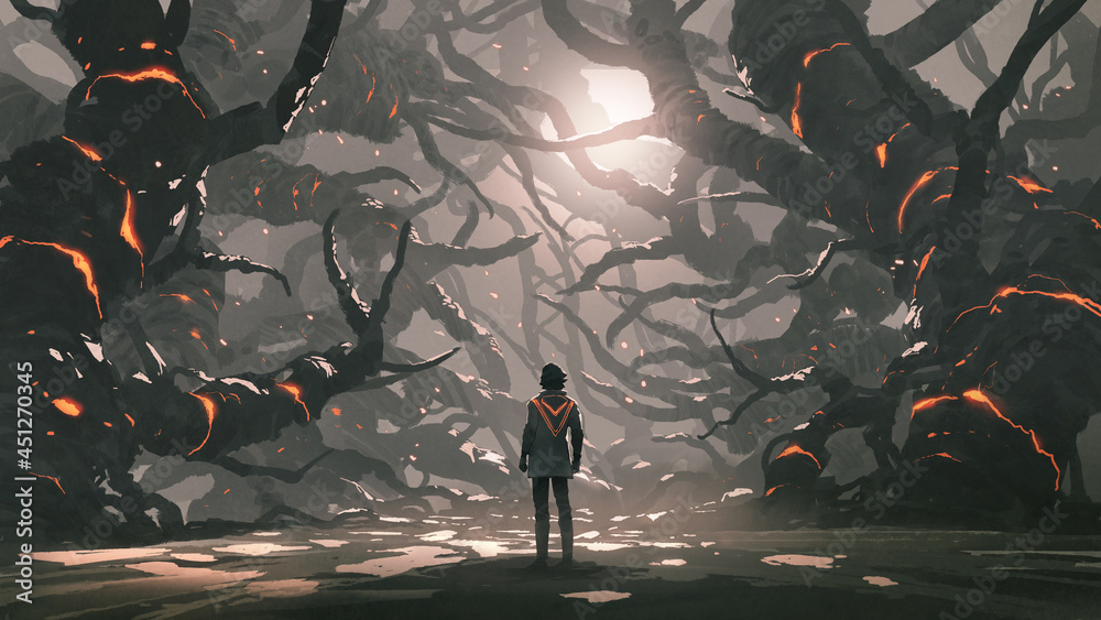 Obraz na plátně The man standing in a road full of evil trees, digital art style, illustration p