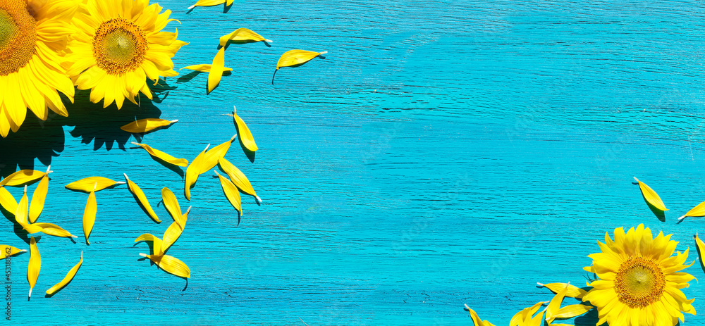 Obraz na plátně Banner with yellow sunflower flowers and petals scattered on vibrant textured turquoise wood