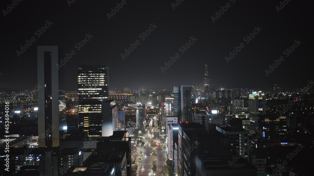 Obraz na plátně Camera moving up high between modern skyscrapers showing beautiful panorama of Seoul Gangnam District on the night, and then getting lower and flying above busy road street with a lot of traffic
