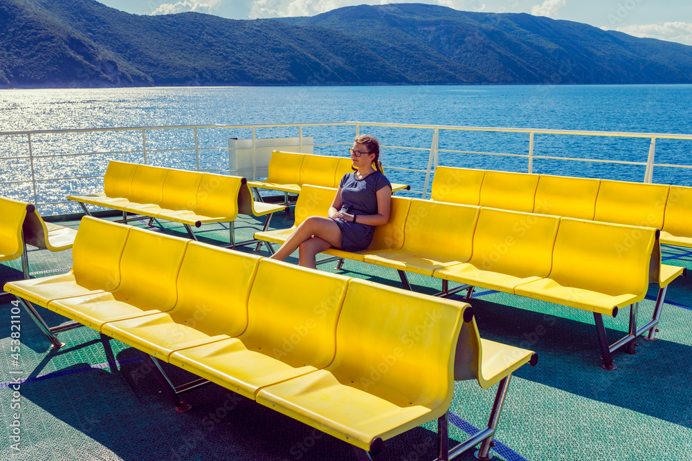 Obraz na plátně Sea journey - young girl on the upper deck of the ferry - time for a carefree va