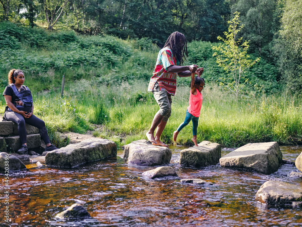 Obraz na plátně UK, Father and daughter walking on rocks shallow creek