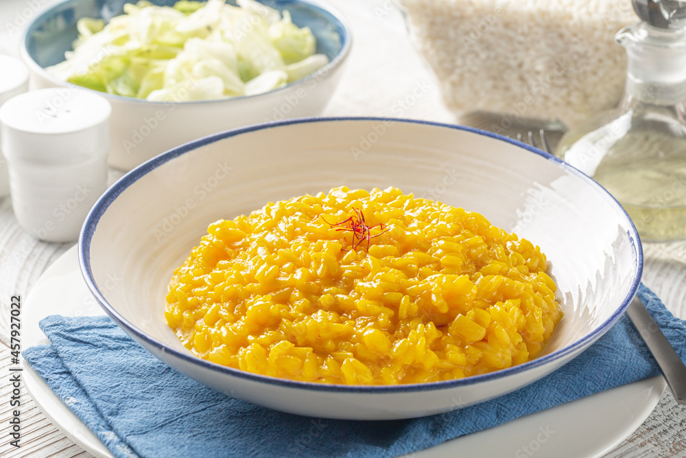 Obraz na plátně Italian dinner with risotto alla milanese and fresh salad