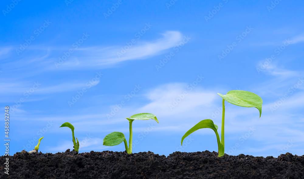 Obraz na plátně Row of plant seedlings growing on fertile soil in 4 germination sequence steps a