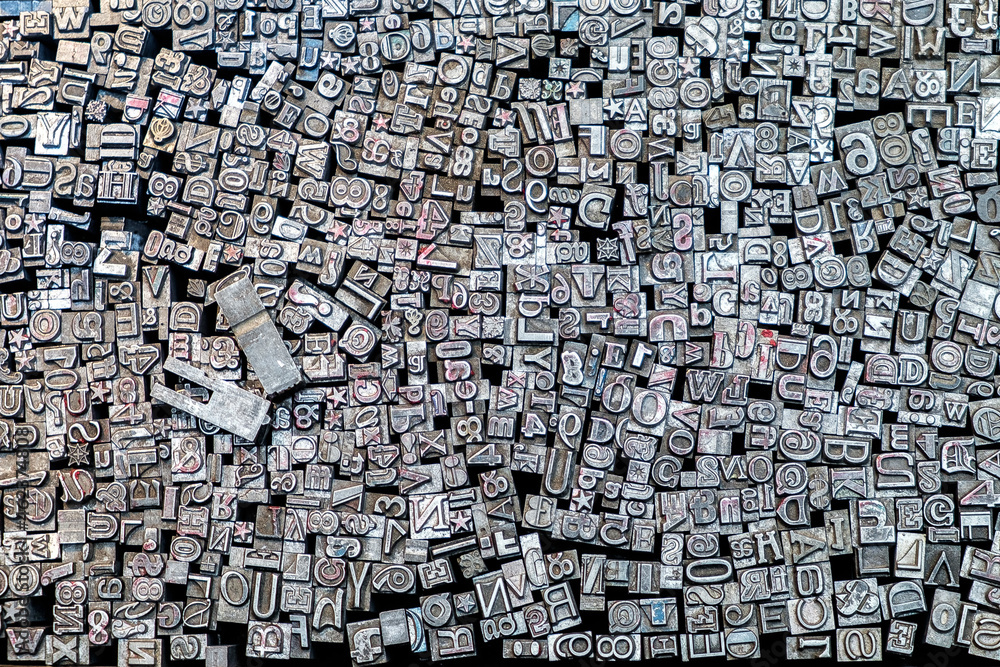 Obraz na plátně Old letterpress metal type for typesetting in a tray on a market stall