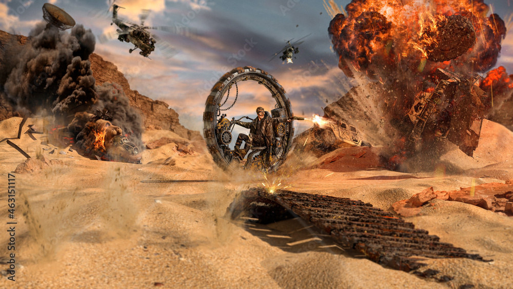 Obraz na plátně a mad man drives away from a monocycle chase by shooting a shotgun at a car in a