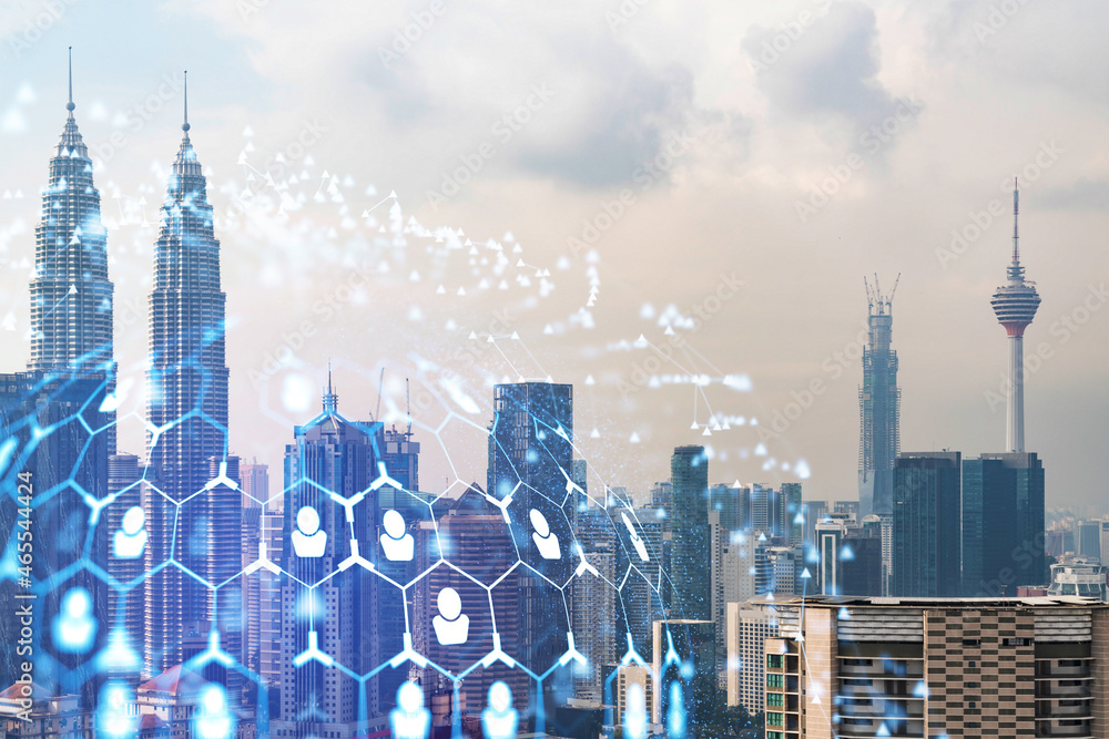 Obraz na plátně Social media icons hologram over panorama city view of Kuala Lumpur, Malaysia, Asia