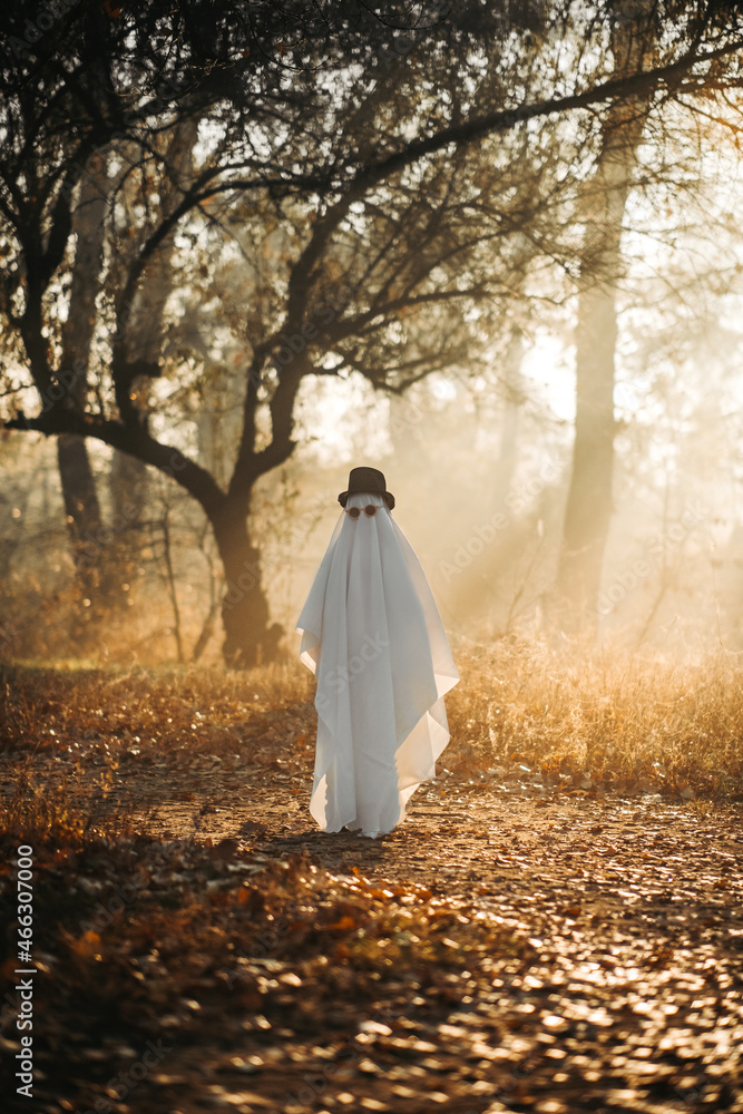 Obraz na plátně A ghost covered with a white ghostly leaf wearing a hat in the forest for Halloween
