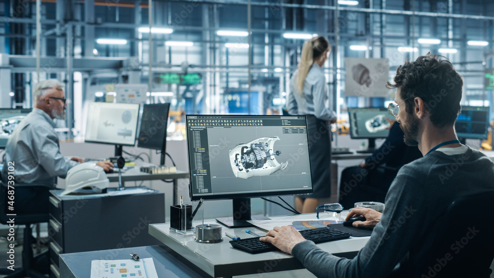 Obraz na plátně Car Factory Office: Engineer Working on Turbine Prototype on Computer, Design Advanced 3D Model for High-Tech Green Energy Electric Engine