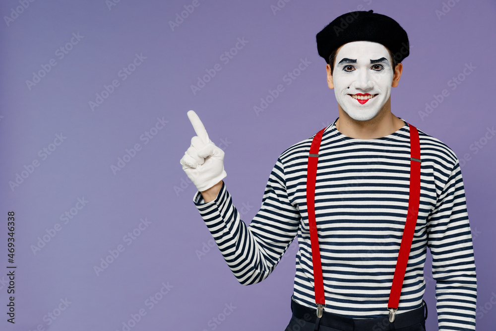 Obraz na plátně Happy charismatic fun young mime man with white face mask wear striped shirt ber