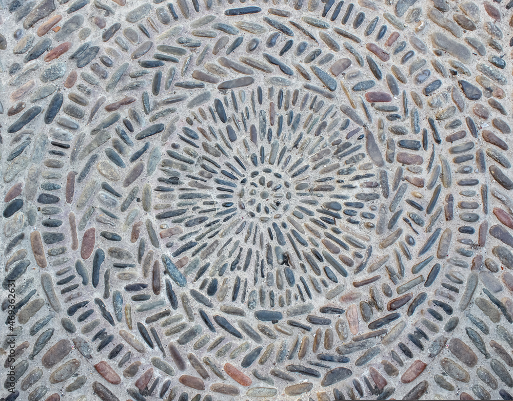 Obraz na plátně Multicolored pebble paved road, round geometric pattern underfoot in the city