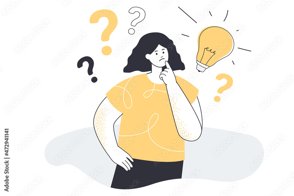 Obraz na plátně Woman wondering with thoughtful face and question marks with idea light bulb above head