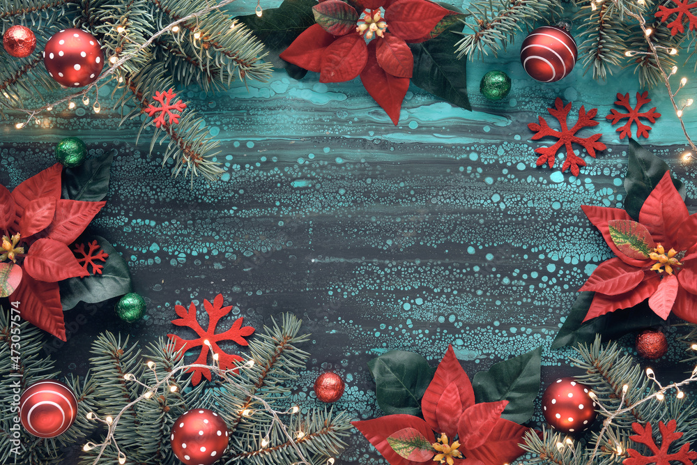 Obraz na plátně Cyan red Christmas frame with poinsettia, fir twigs, glass balls and snowflakes