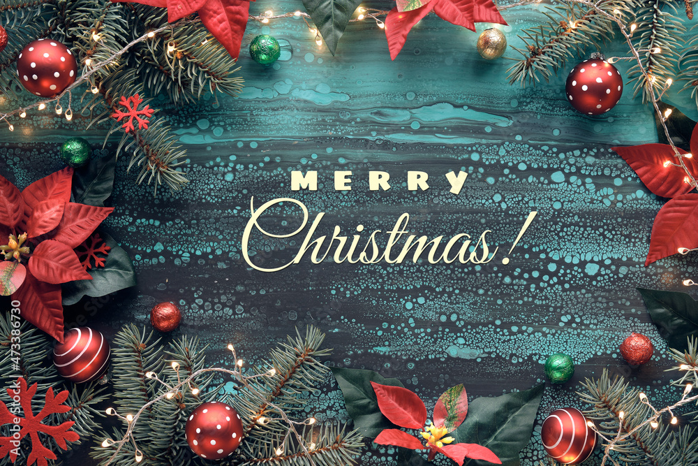 Obraz na plátně Merry Christmas Cyan red Christmas frame with poinsettia, fir twigs, glass balls and snowflakes