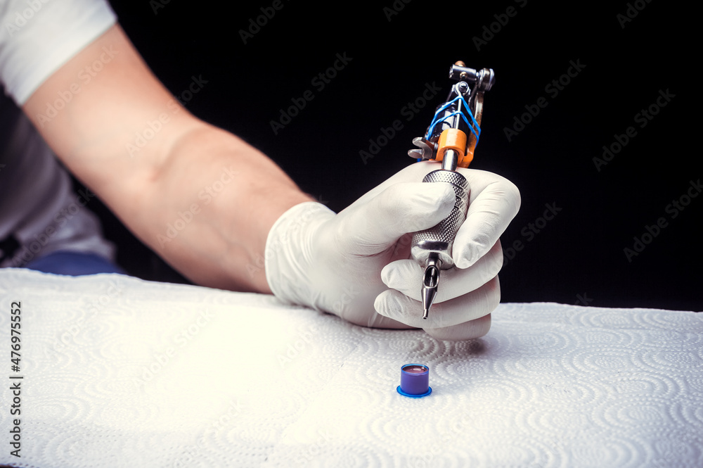Obraz na plátně Hand of a tattooer, carefully holding a tattoo device.