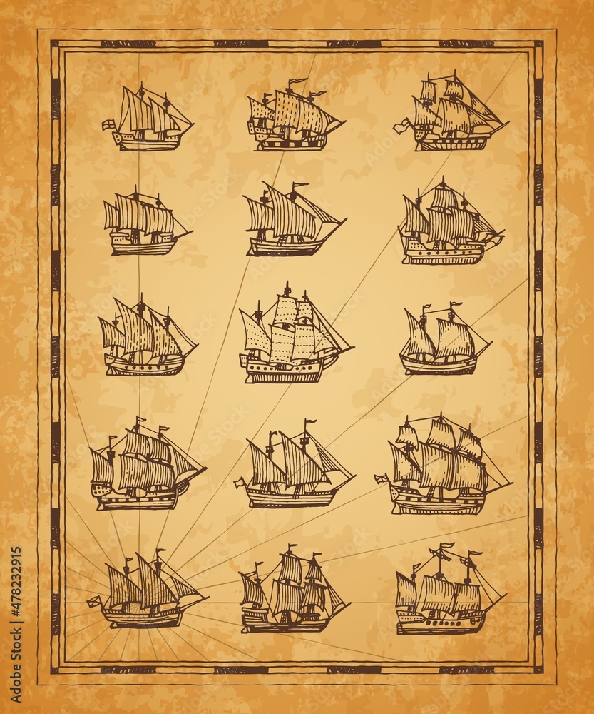 Obraz na plátně Vintage map sail ships, sailboat, brigantine sketch