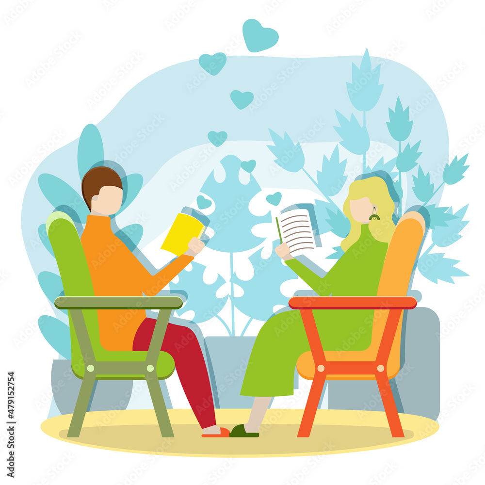 Obraz na plátně book reading man woman love books home library people armchair flowers heart pas