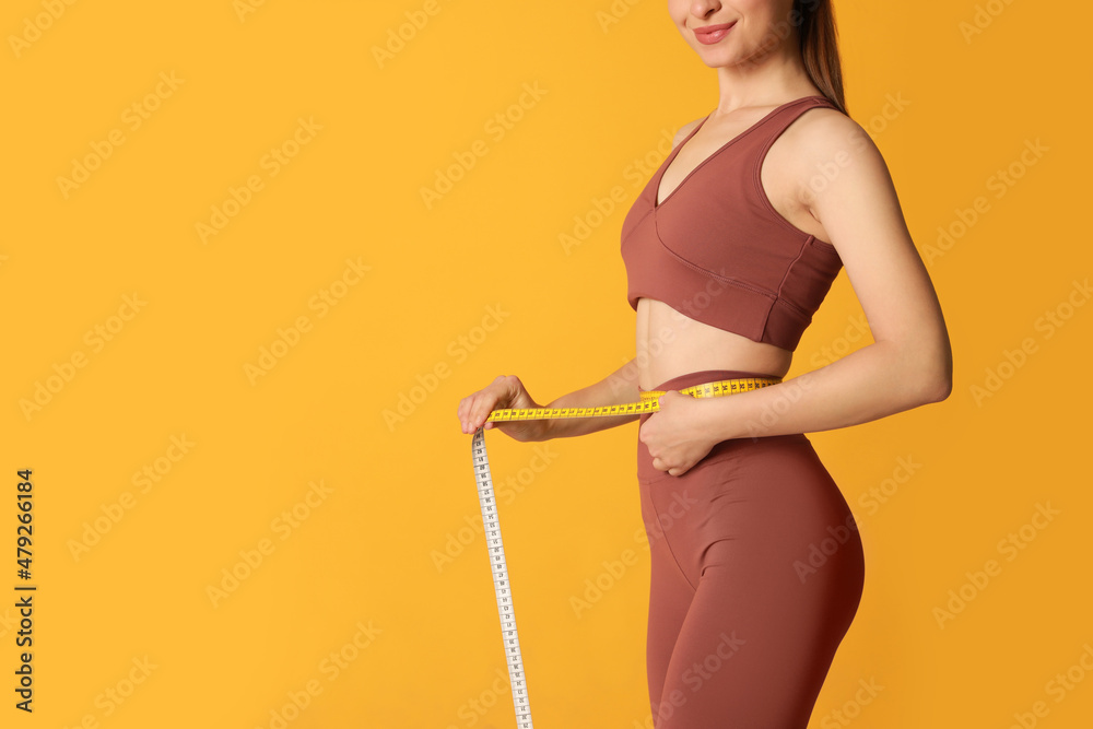 Obraz na plátně Happy woman in sportswear measuring waist with tape on yellow background, closeup