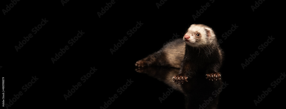 Obraz na plátně Portrait of fluffy ferret lying on floor isolated on dark background