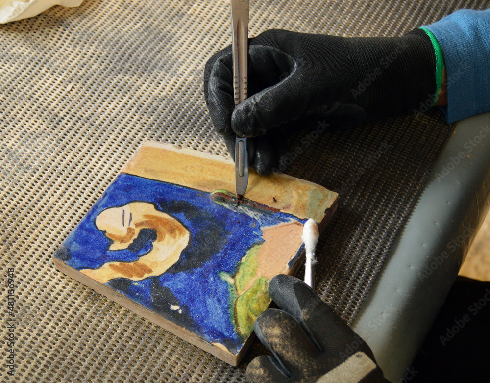 Obraz na plátně Cleaning old tiles with a scalpel and cotton swab
