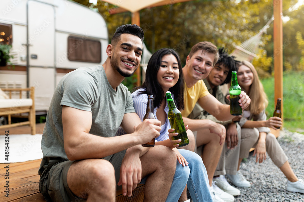 Obraz na plátně Diverse young friends having party near RV outdoors, drinking beer, communicatin