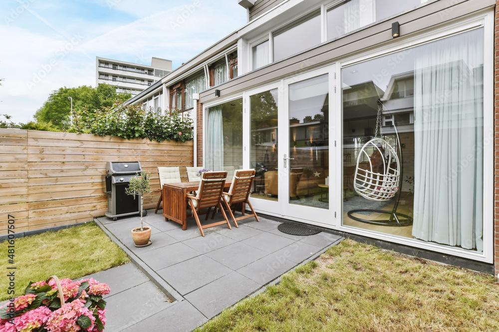 Obraz na plátně Charming courtyard of the house with a barbecue and a wooden table with upholste