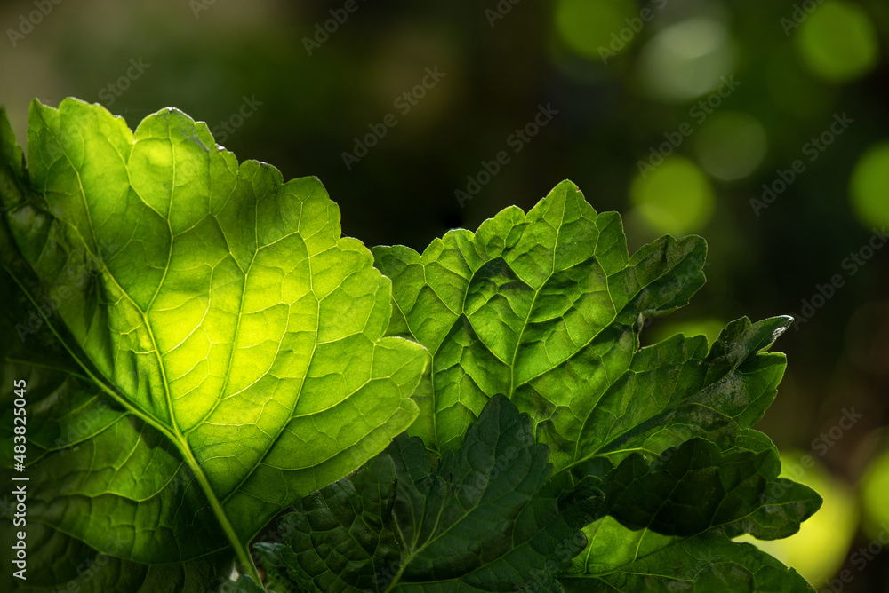 Obraz na plátně Patchouli branch green leaves on bokeh nature background.