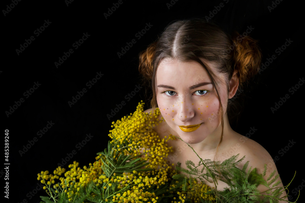 Obraz na plátně Portrait of a girl with mimosa close-up