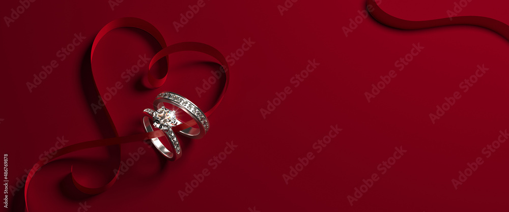 Obraz na plátně 2 white gold engagement rings with diamonds and a heart-shaped ribbon on a red background