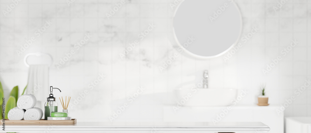 Obraz na plátně Modern white bathroom tabletop with copy space and a set of bathroom product