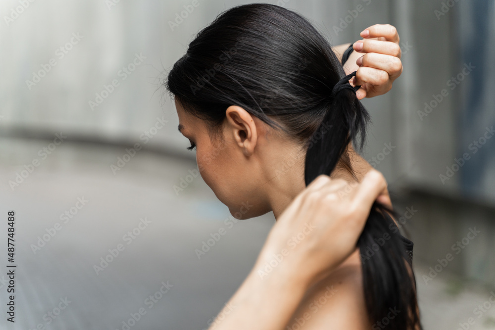 Obraz na plátně Young woman fastening her ponytail with elastic