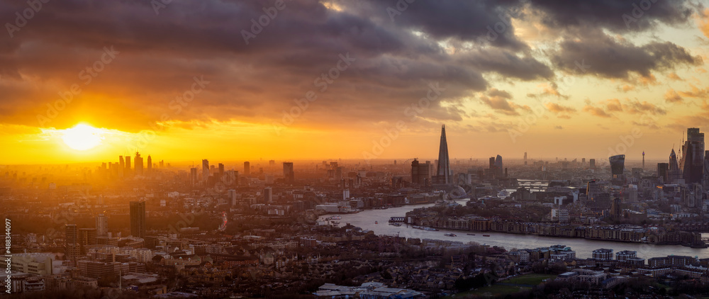 Obraz na plátně Wide, elavated panoramic sunset view of the urban skyline of London, England, wi